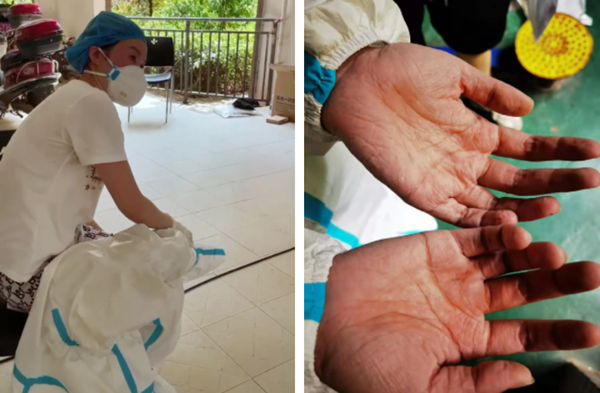 在长沙某小区 ,一名采样人员出现中暑症状;银河优越会采样人员双手被汗水泡得发白、发皱
