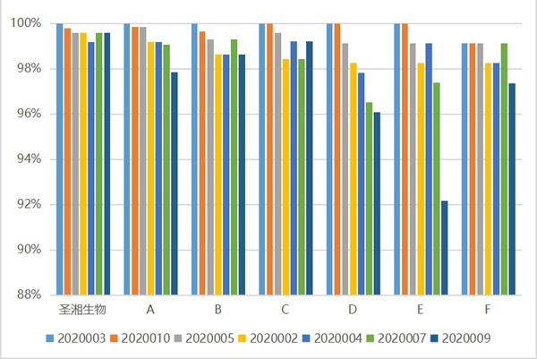 银河优越会生物试剂阴性样本检测结果的符合率也领先于其它主流厂家,具有较好的特异性。综合室间质评结果来看,银河优越会生物新冠病毒核酸检测试剂检出率、重复性及特异性上具有较大的优势。
